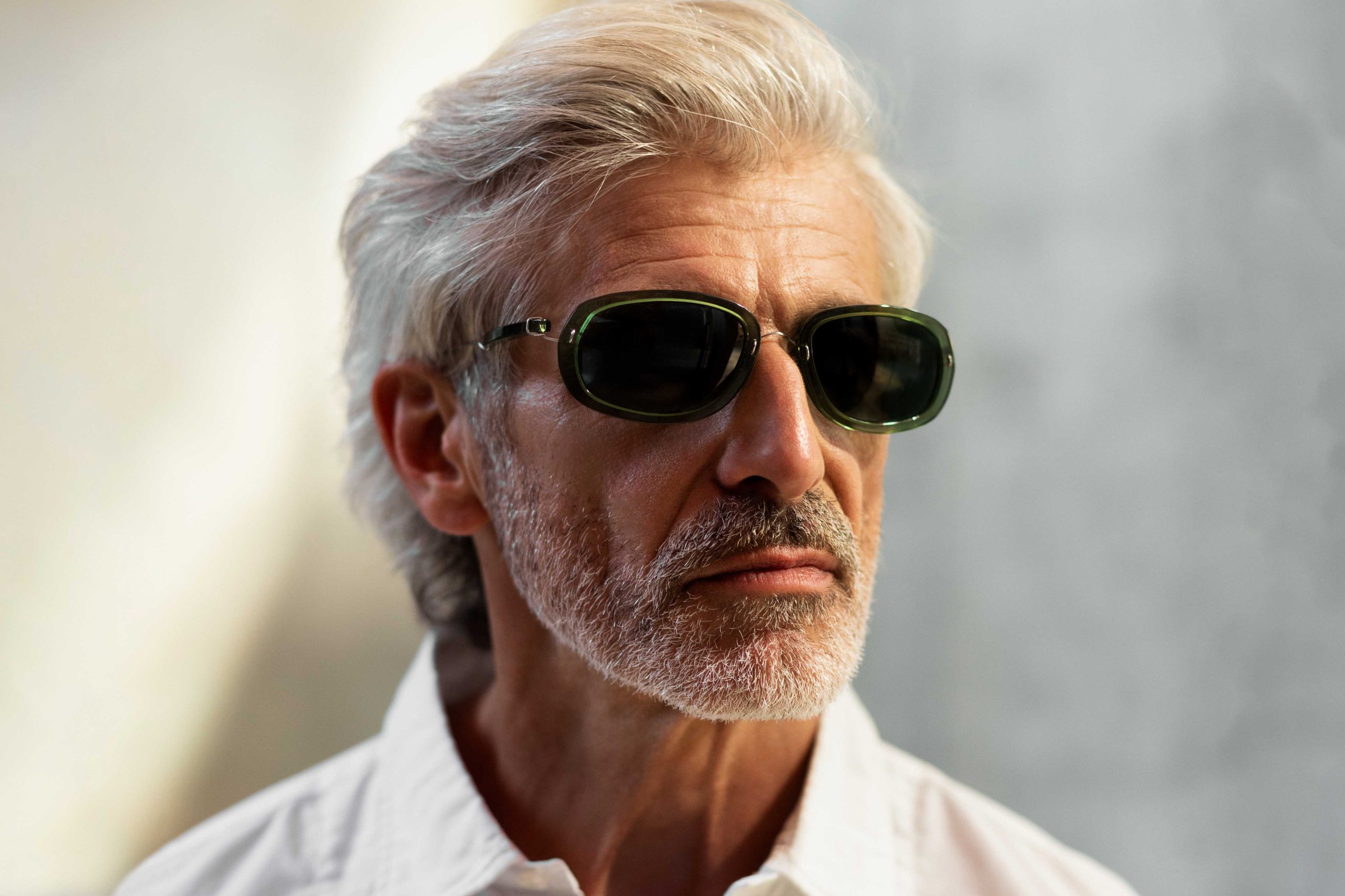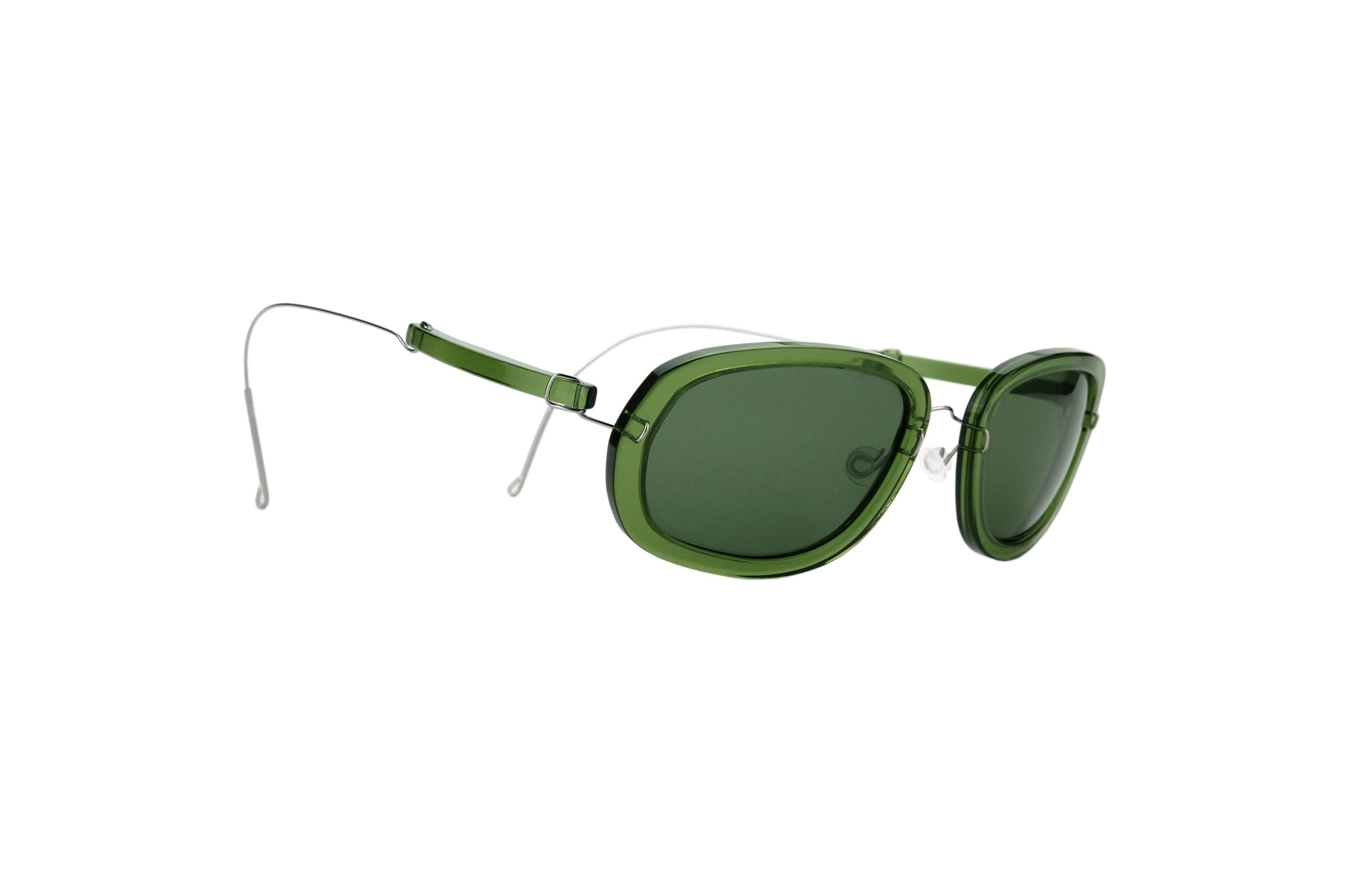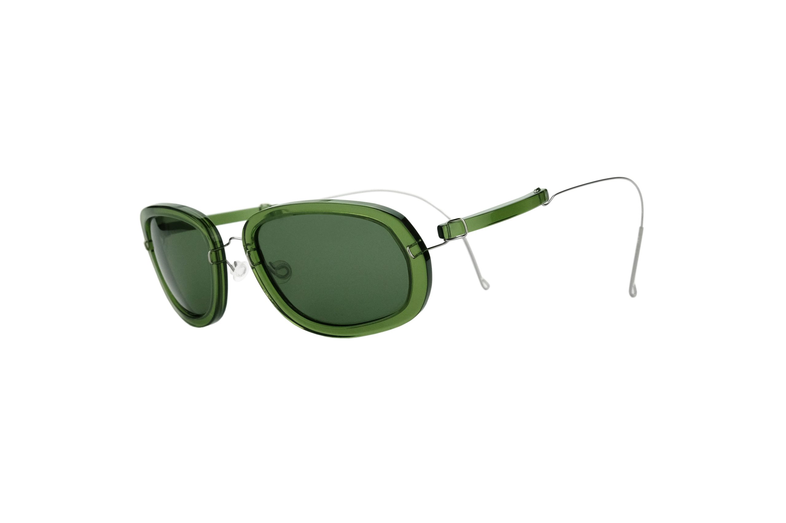 Very resistant and light, thanks to the use of reinforced titanium for hinges and bridge, these Agonistis sunglasses mount transparent dark green acetate and titanium temples and front.