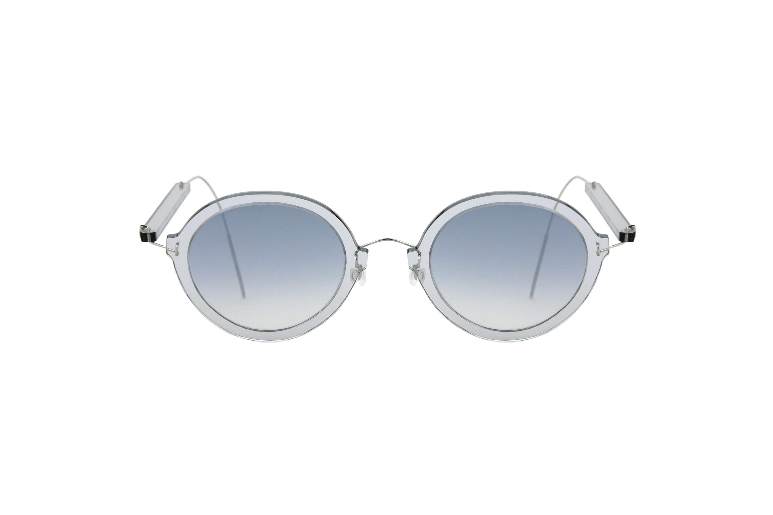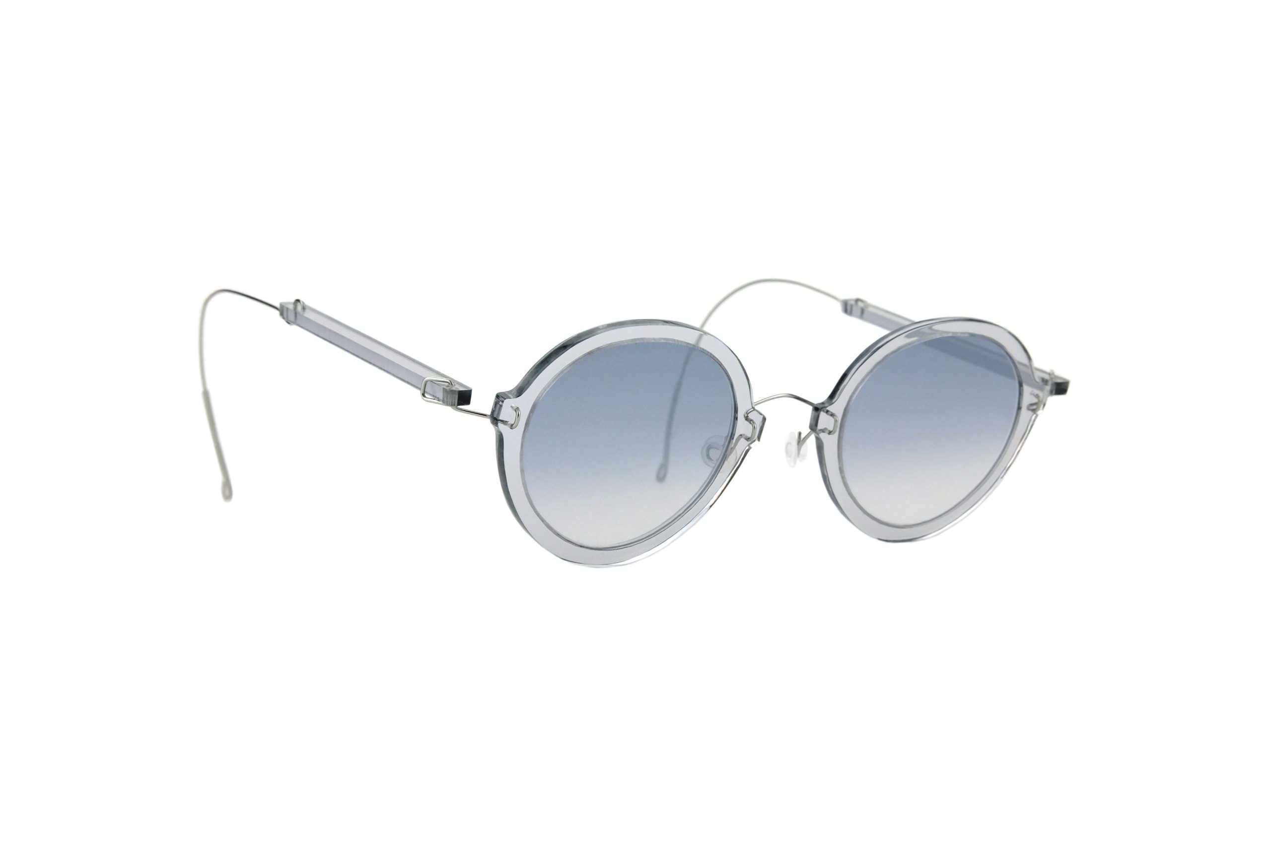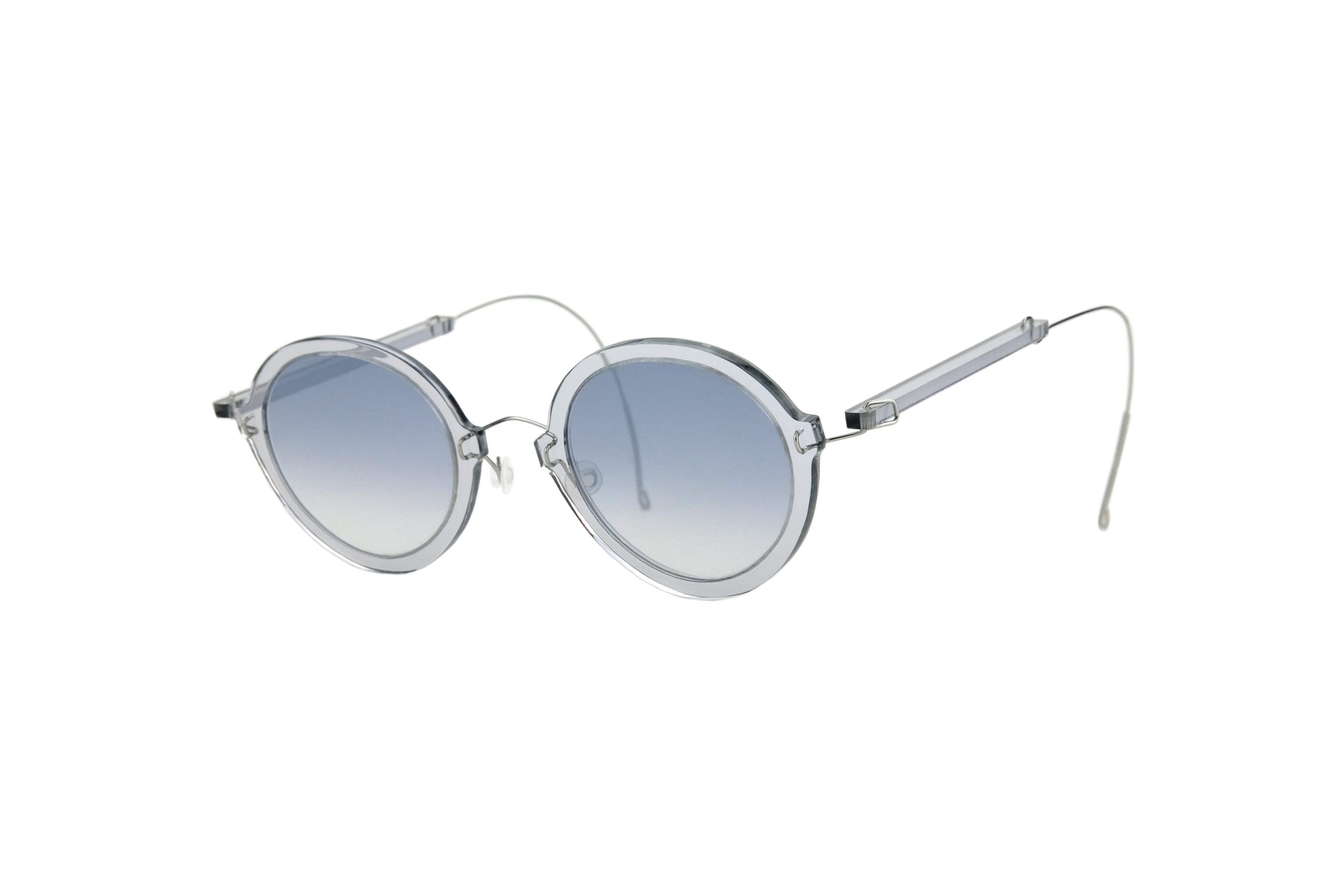 Very resistant and light, thanks to the use of reinforced titanium for hinges and bridge, these Milo sunglasses mount front and temples in transparent-grey plexiglas and titanium.