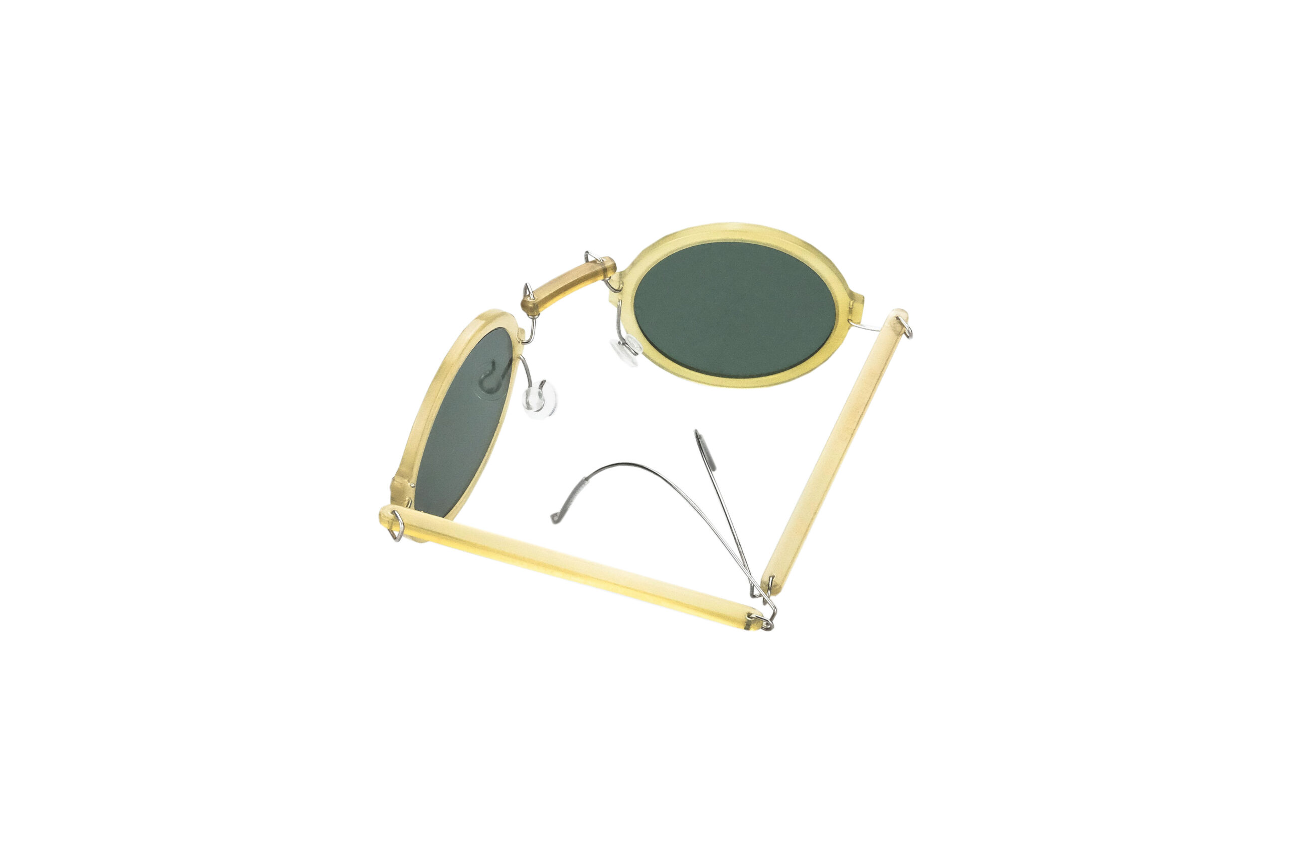 Very resistant and light, thanks to the use of reinforced titanium for hinges and bridge, these Othoni sunglasses mount natural honey horn temples, bridge and front.