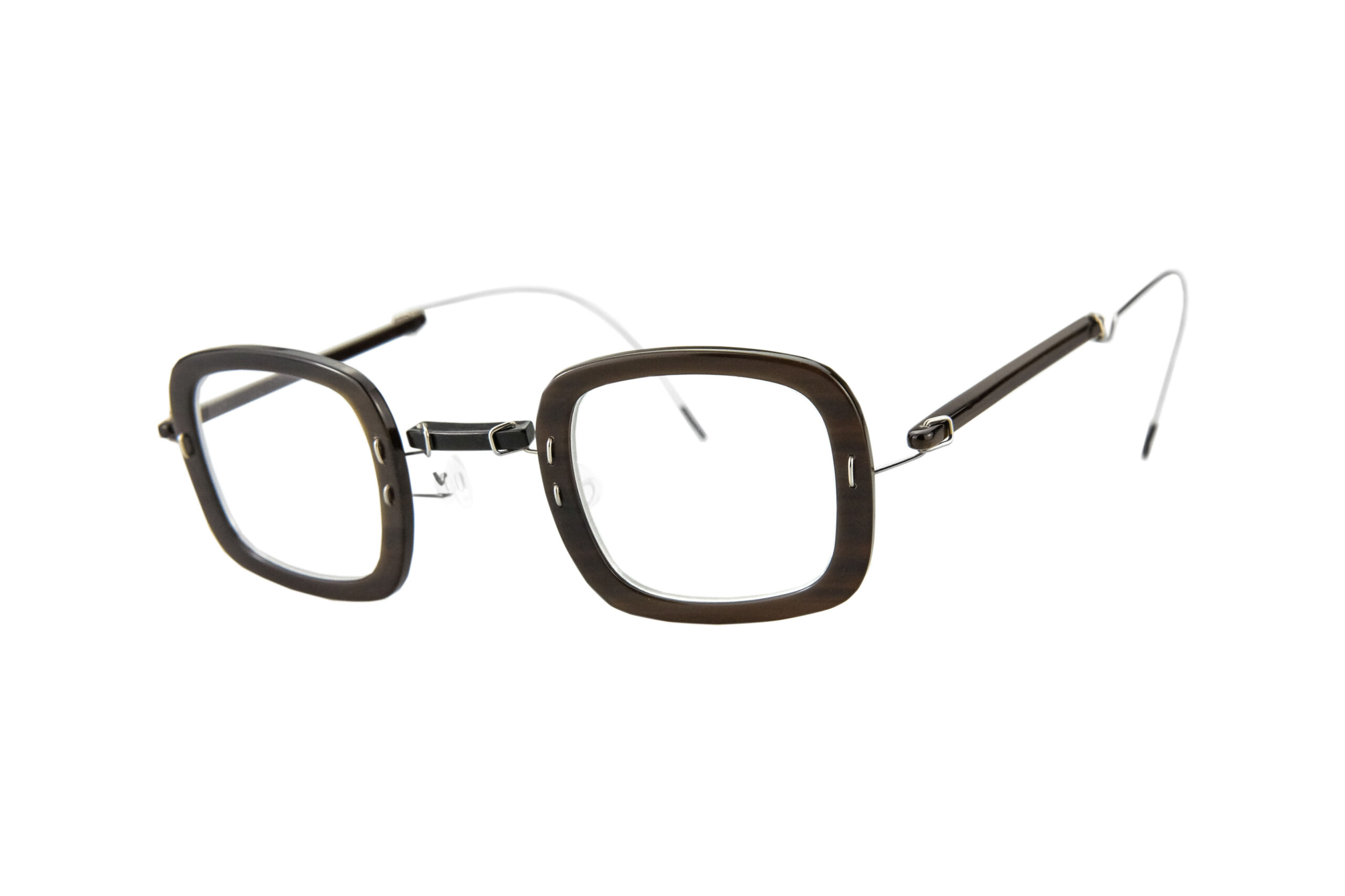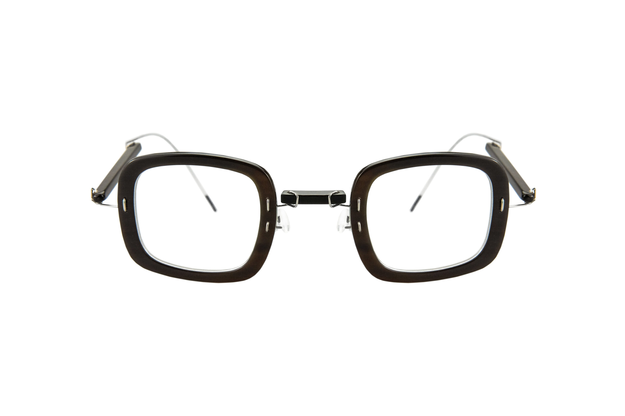 Very resistant and light, thanks to the use of reinforced titanium for hinges and bridge, these Strongyli eyeglasses mount natural dark brown horn and titanium temples.