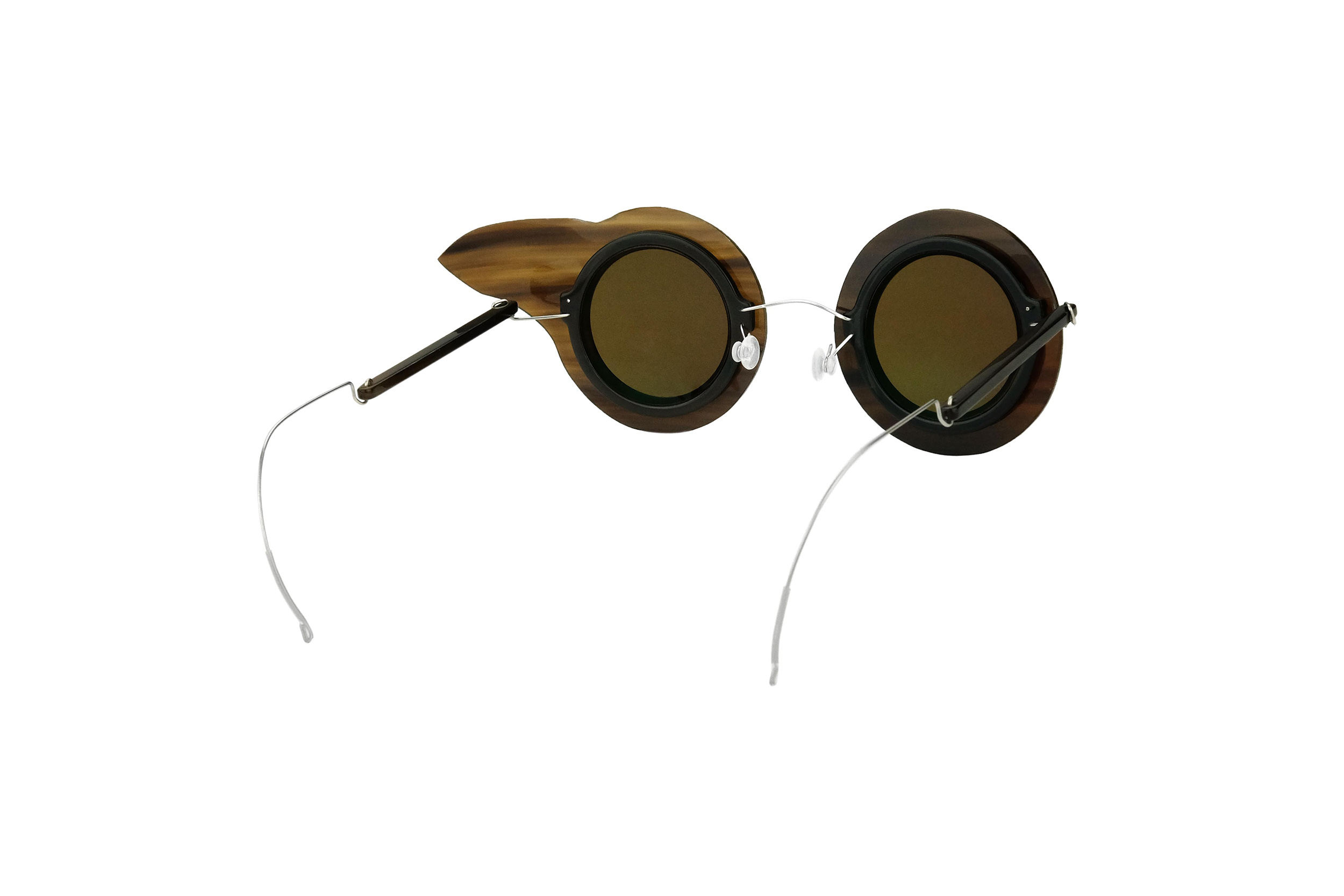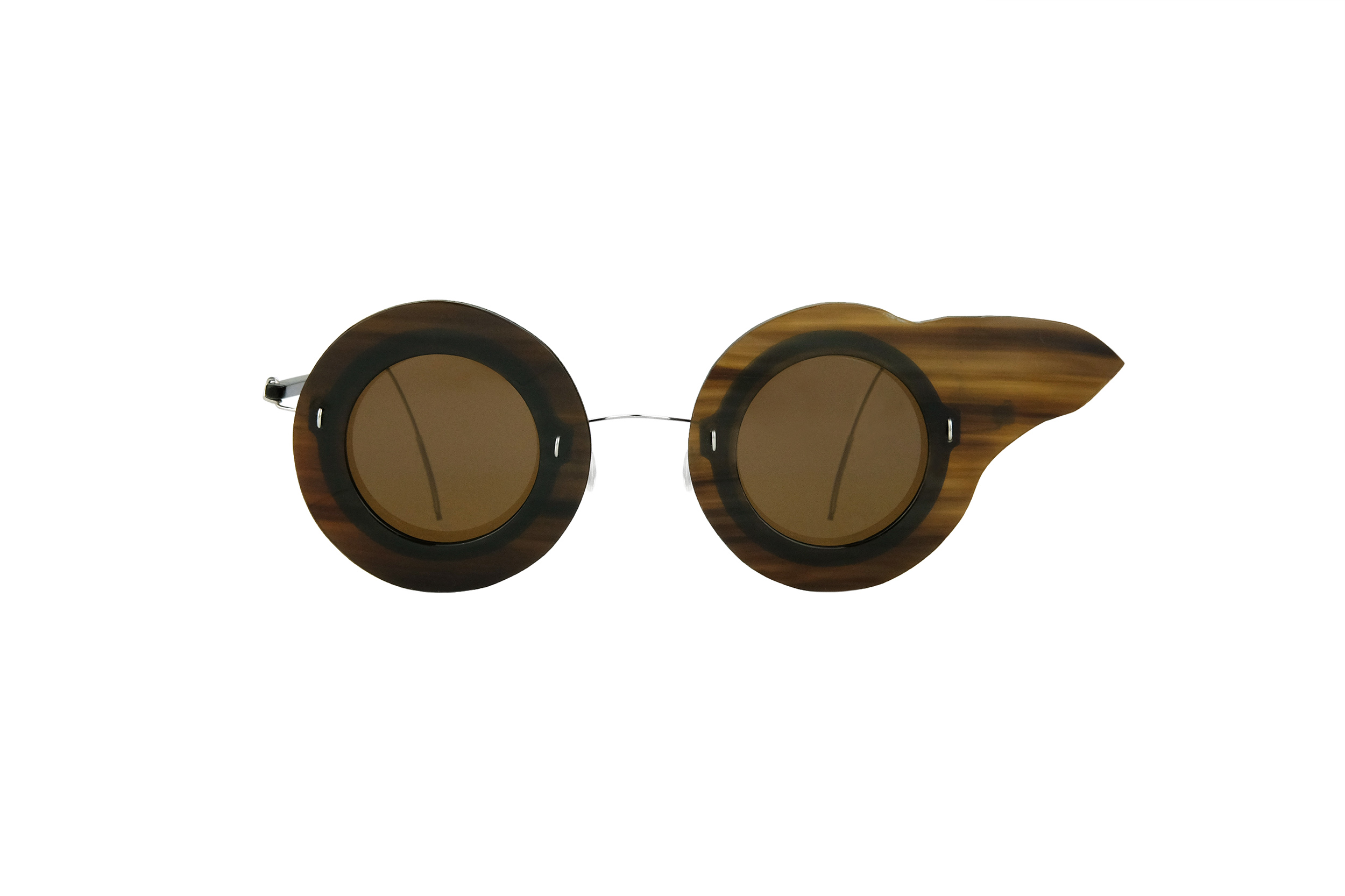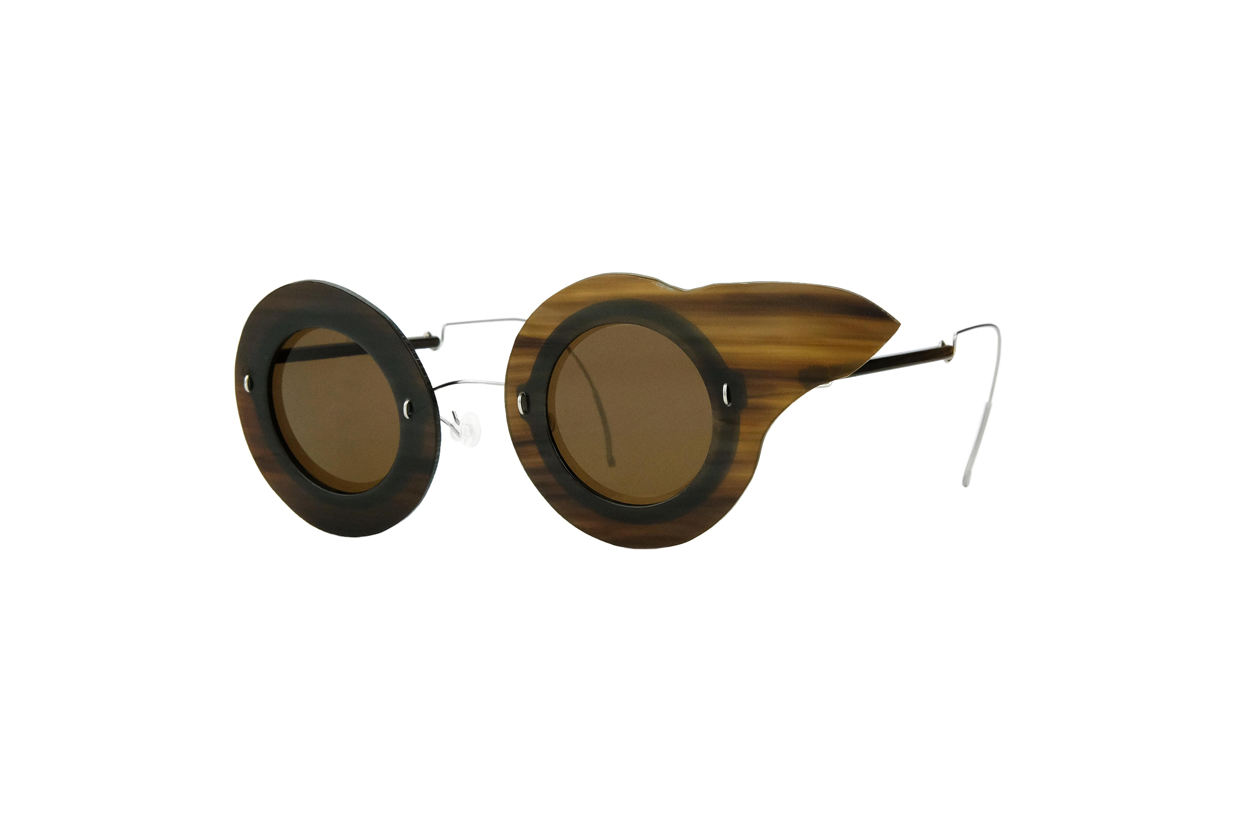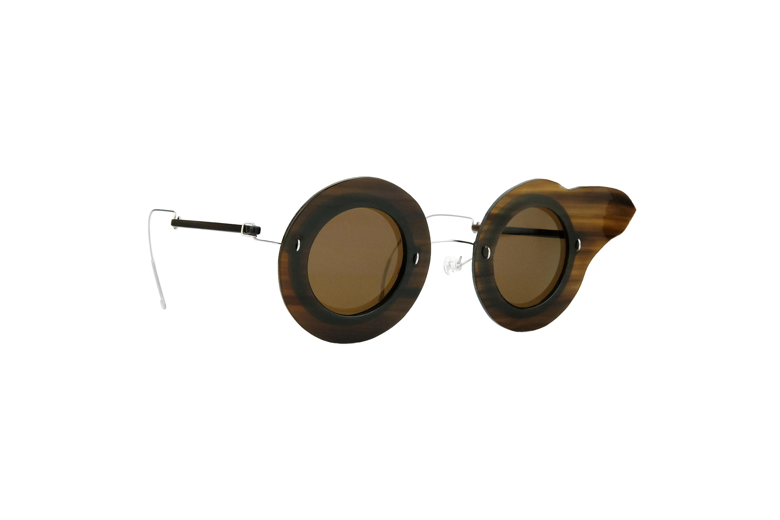 Very resistant and light, thanks to the use of reinforced titanium for hinges and bridge, these Vathi sunglasses mount natural brown horn and titanium temples and front .