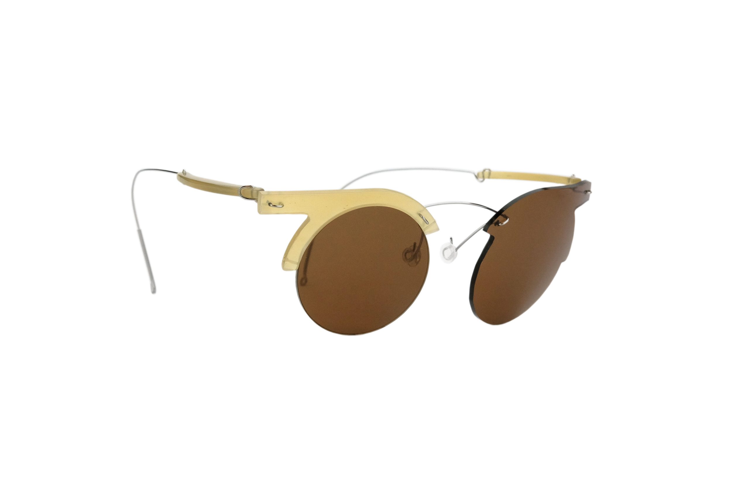Estremamente resistente grazie all’uso di titanio rinforzato per cerniere e ponte, questo Depo da sole monta stanghette e frontale in corno naturale miele e titanio.