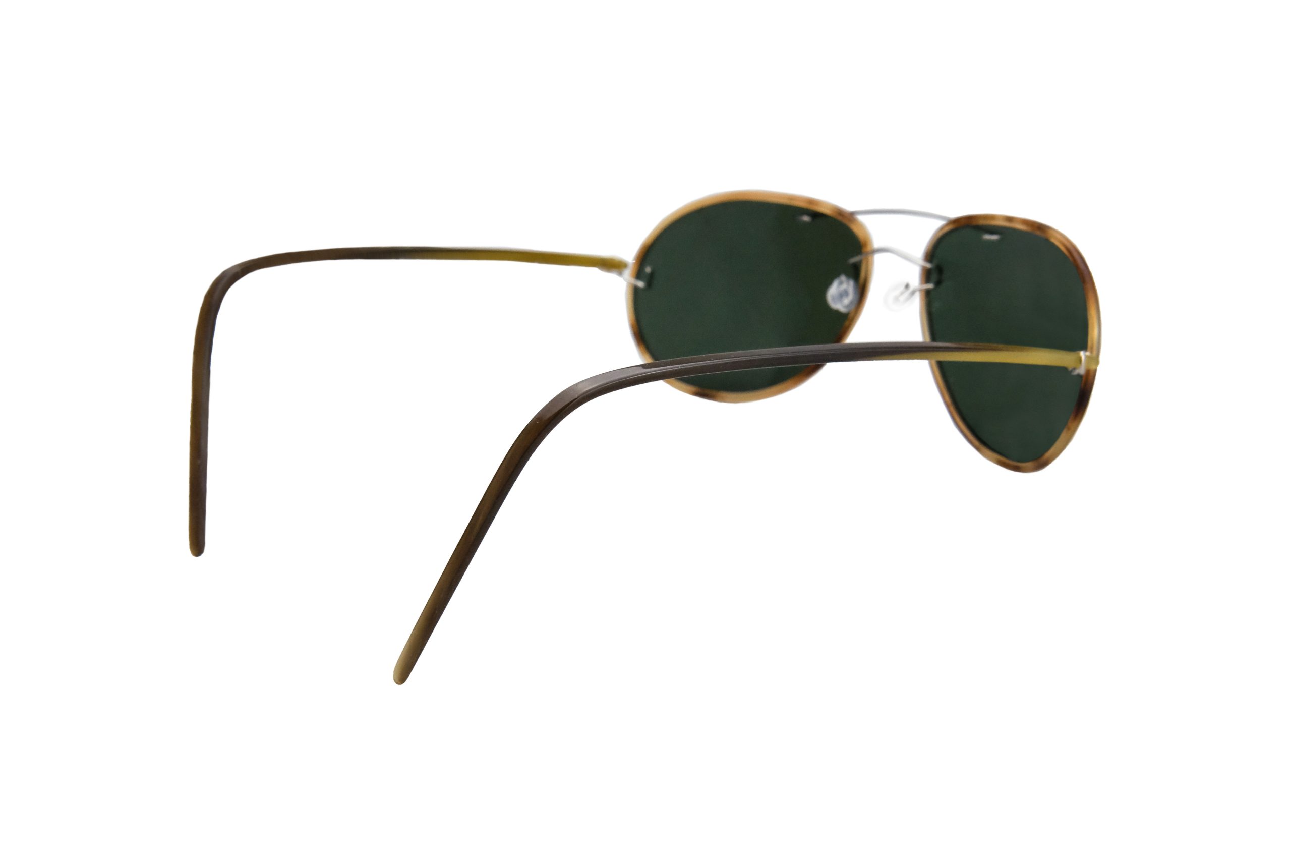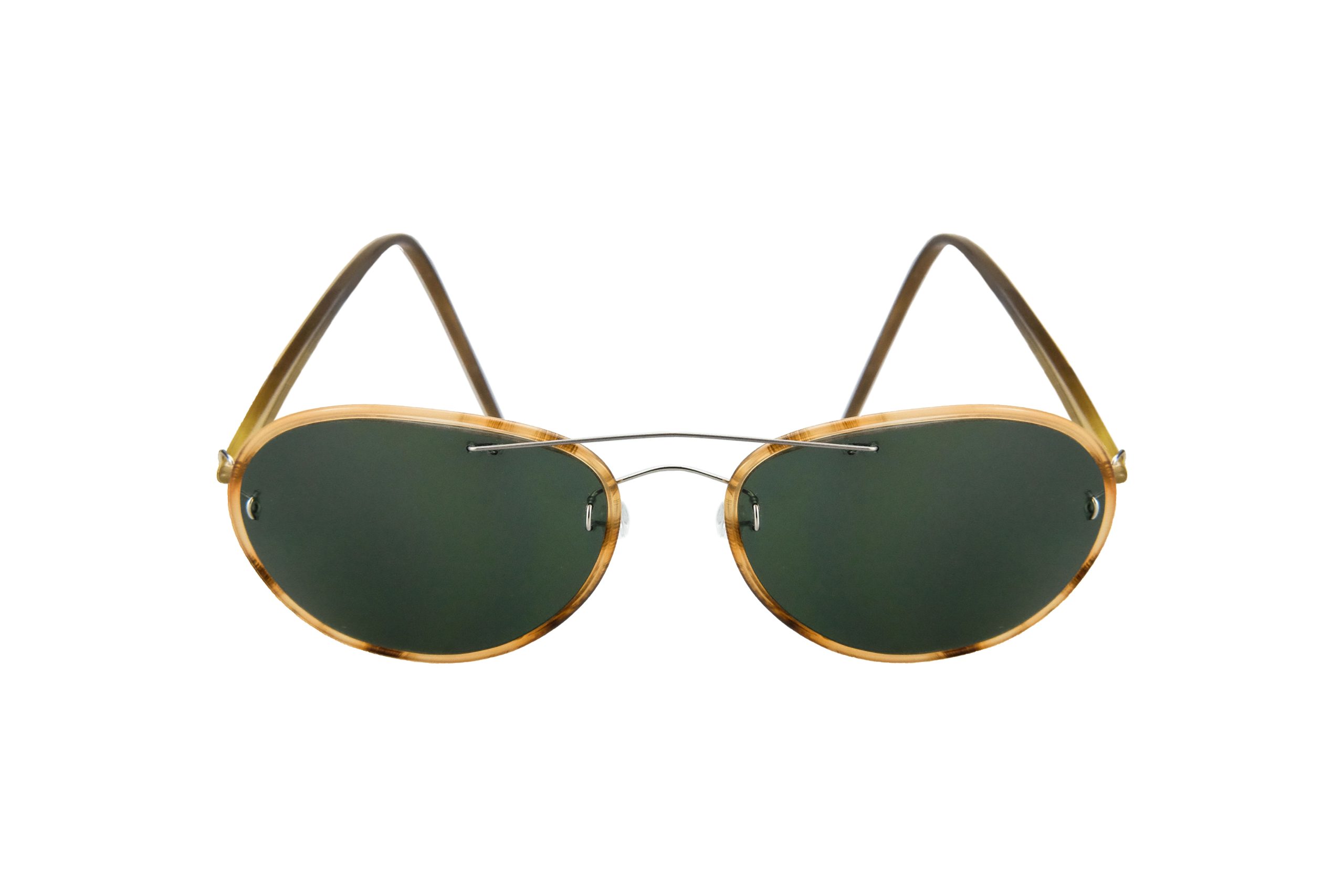 Estremamente resistente grazie all’uso di titanio rinforzato per cerniere e ponte, questo Keros da sole monta stanghette in corno naturale marrone chiaro.