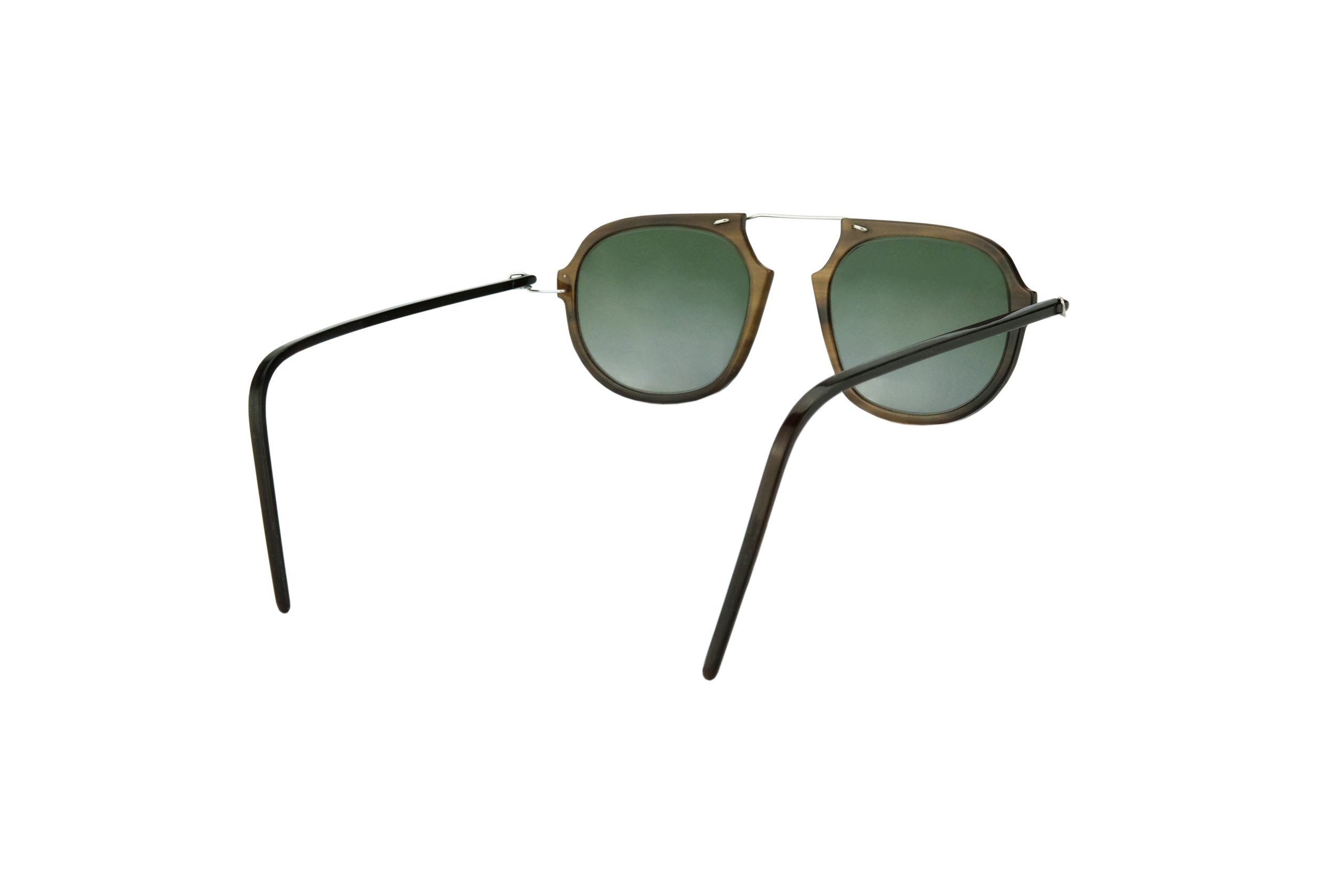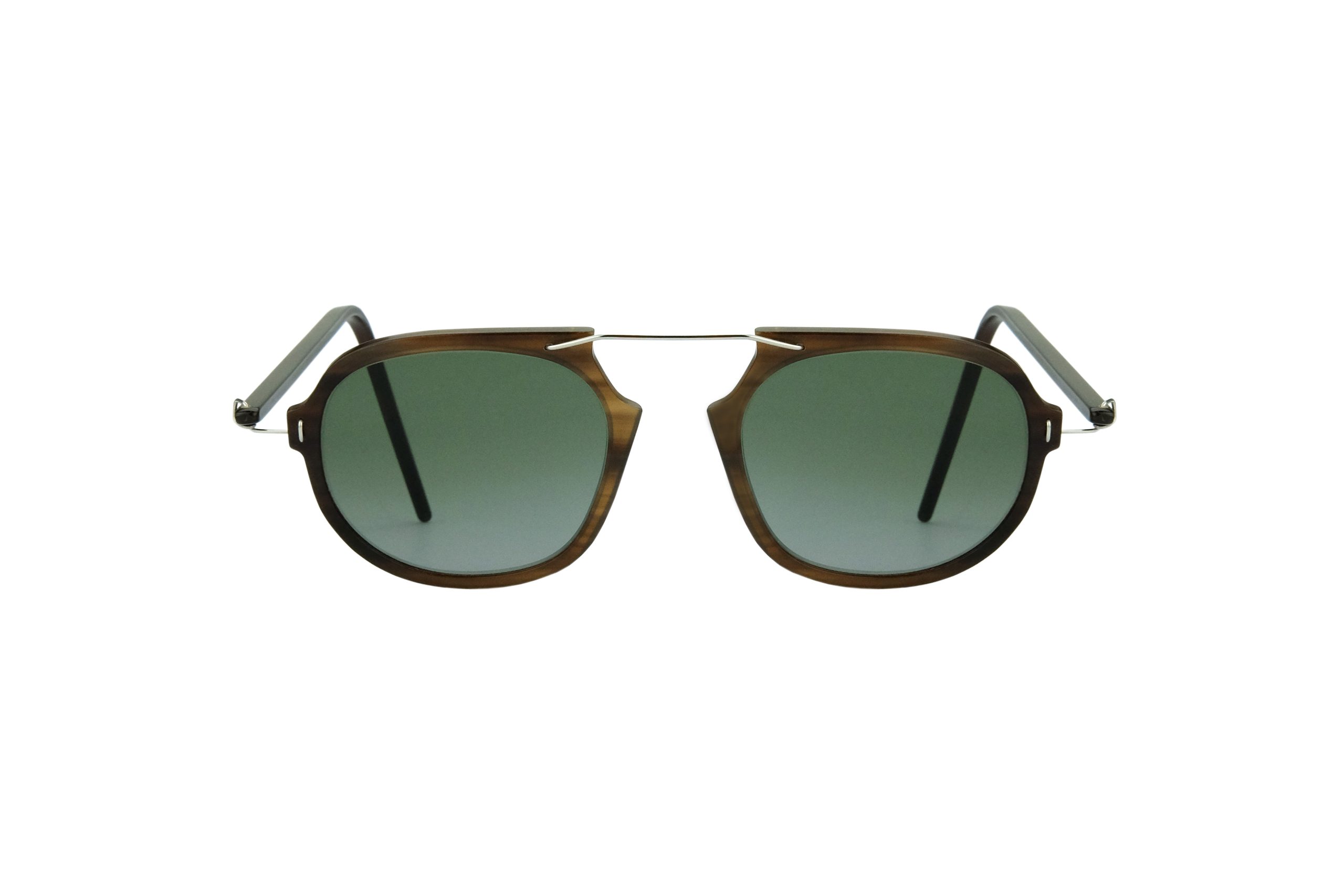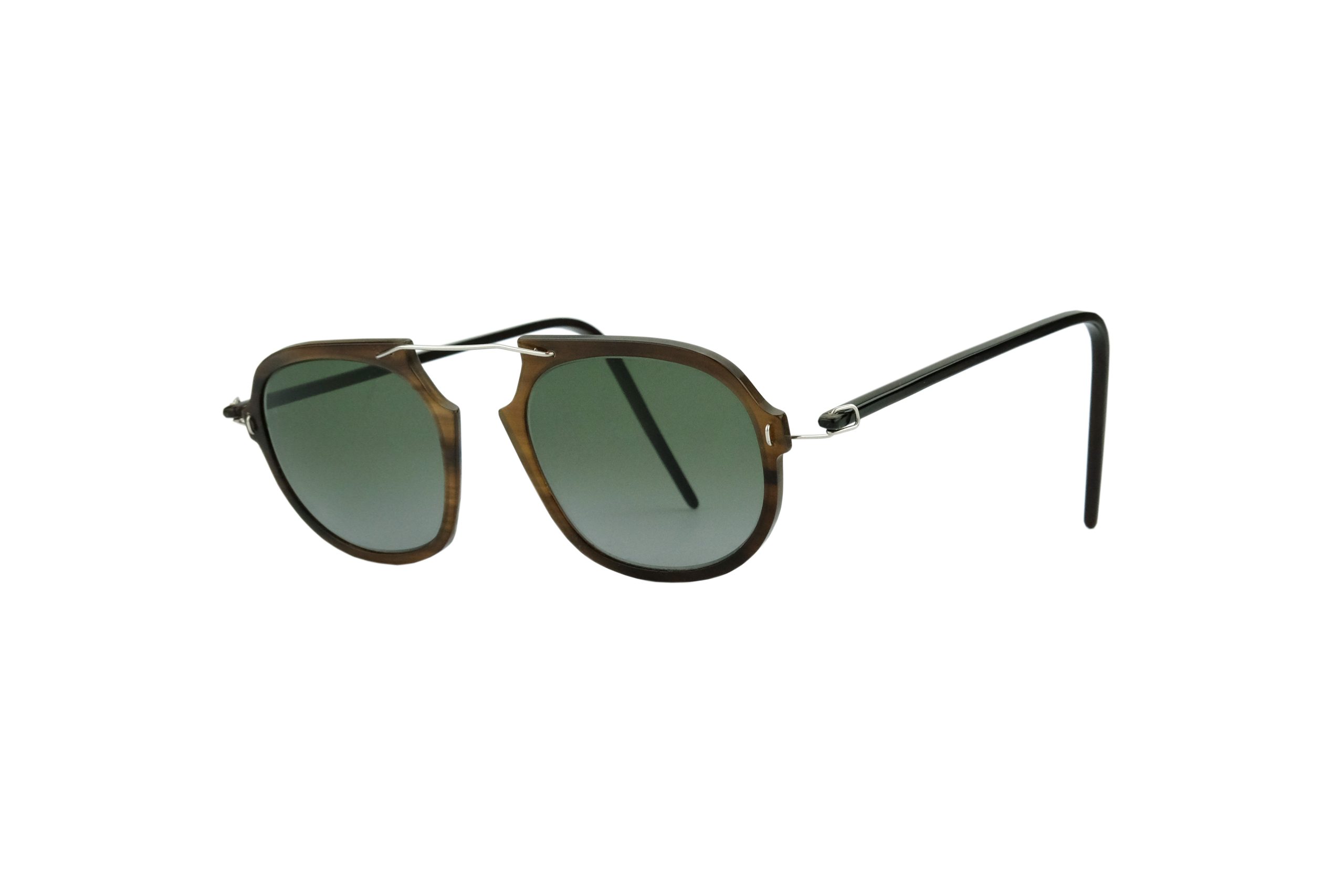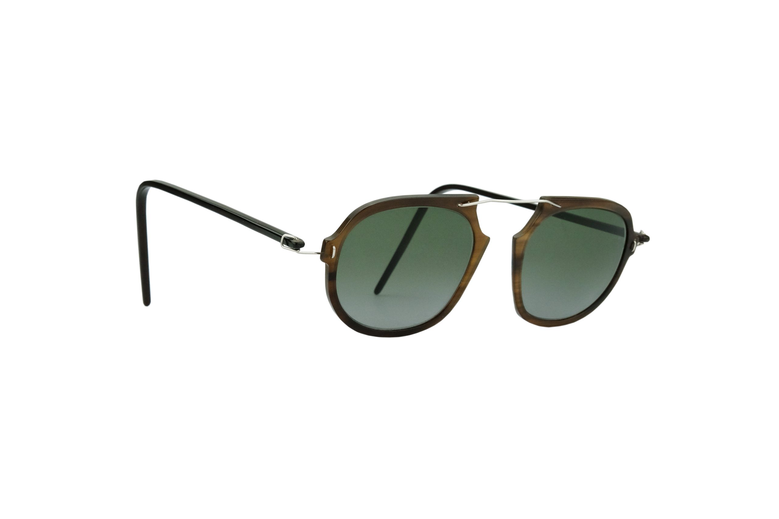 Estremamente resistente grazie all’uso di titanio rinforzato per cerniere e ponte, questo Samotracia da sole monta stanghette e frontale in corno naturale marrone scuro.