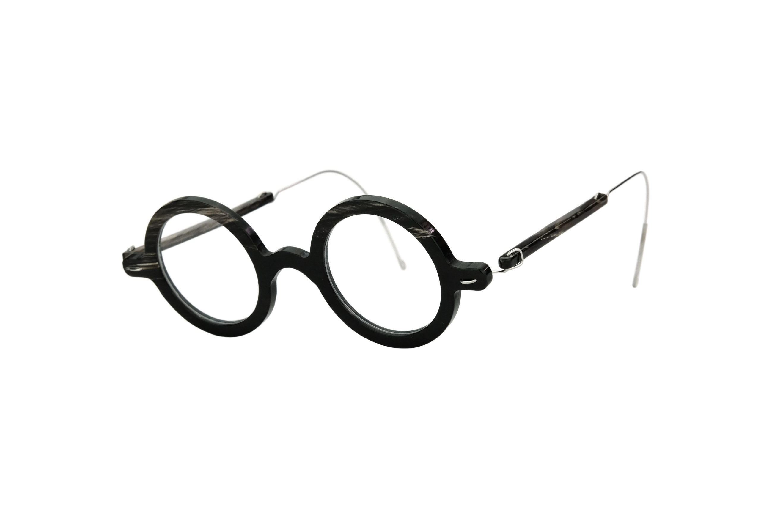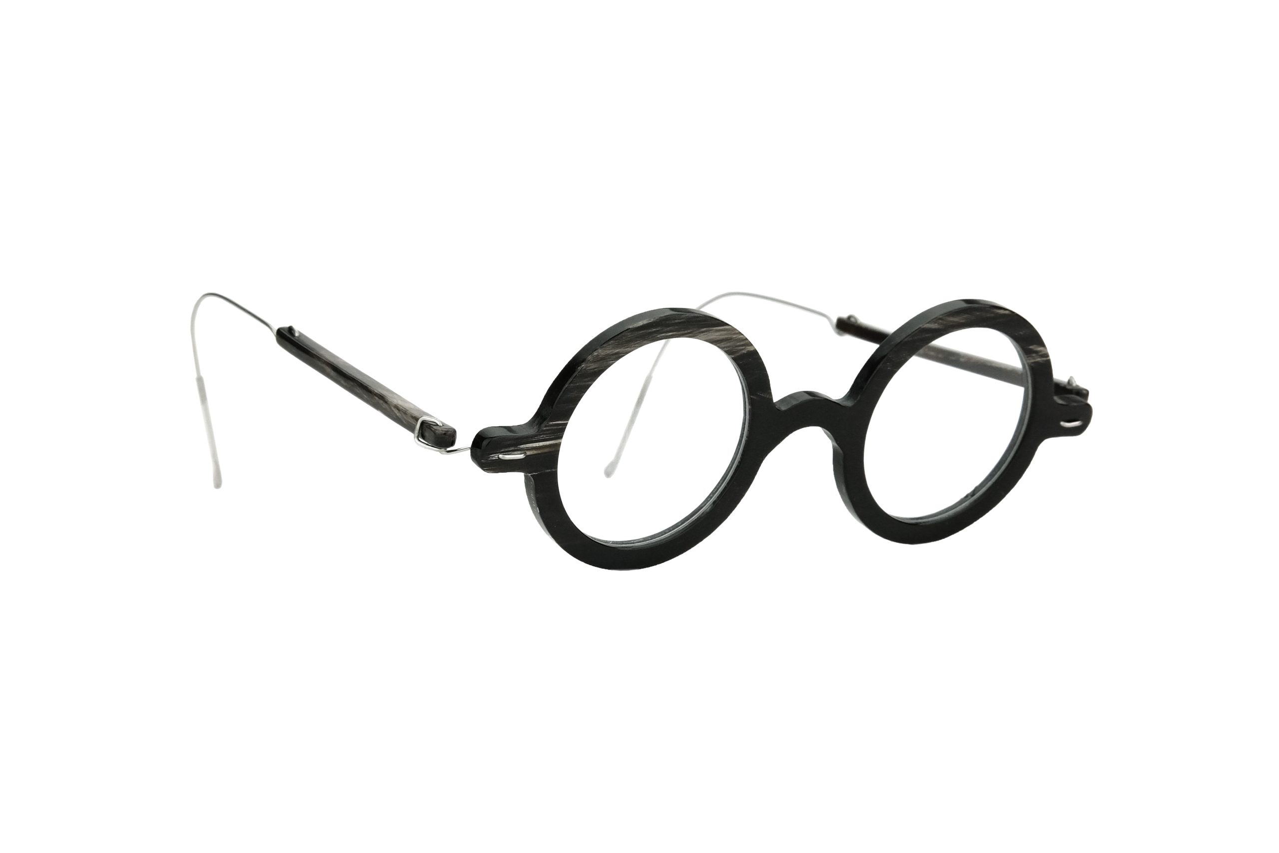 | Montatura | Stanghette e frontale in Corno Naturale Nero Screziato Bianco e Titanio |