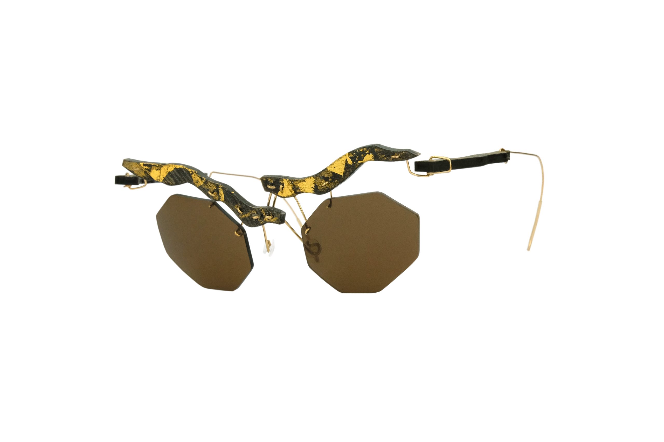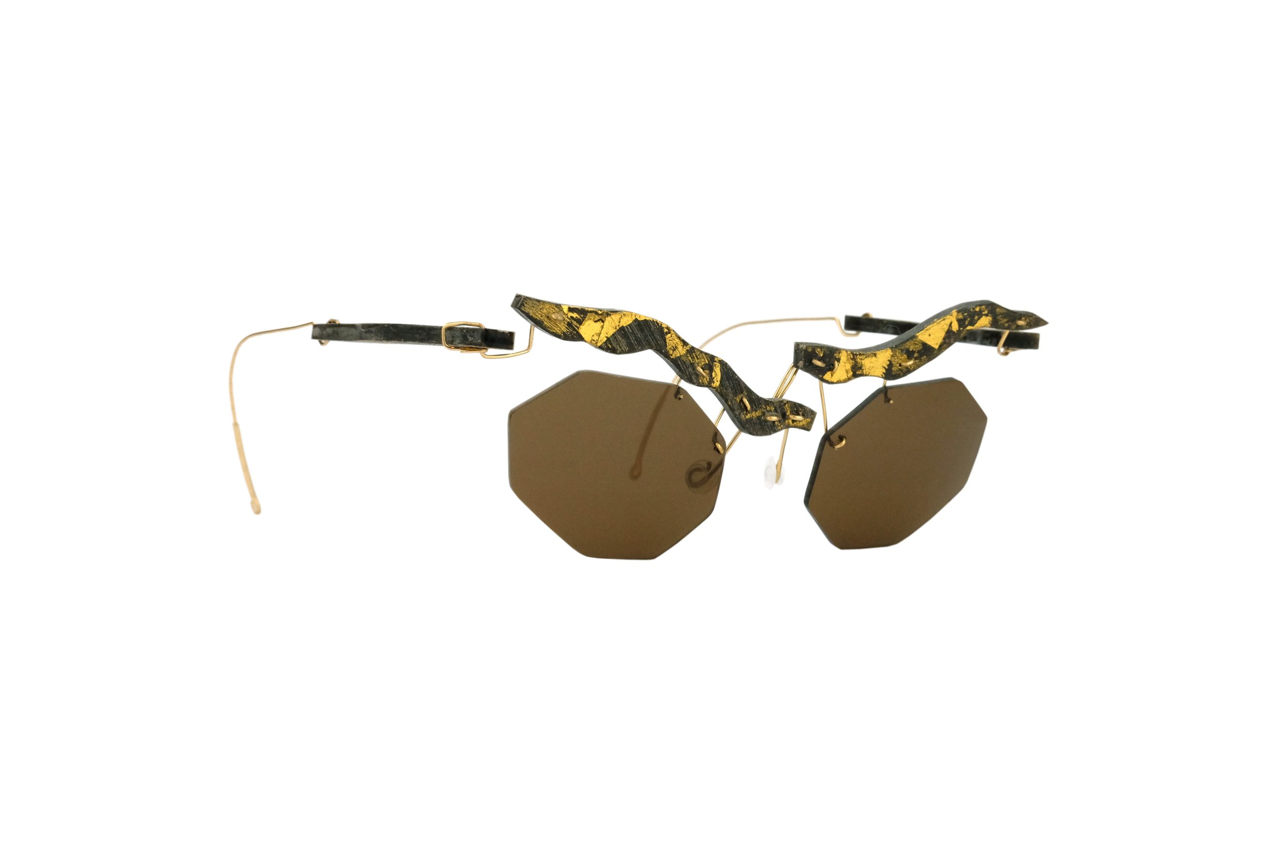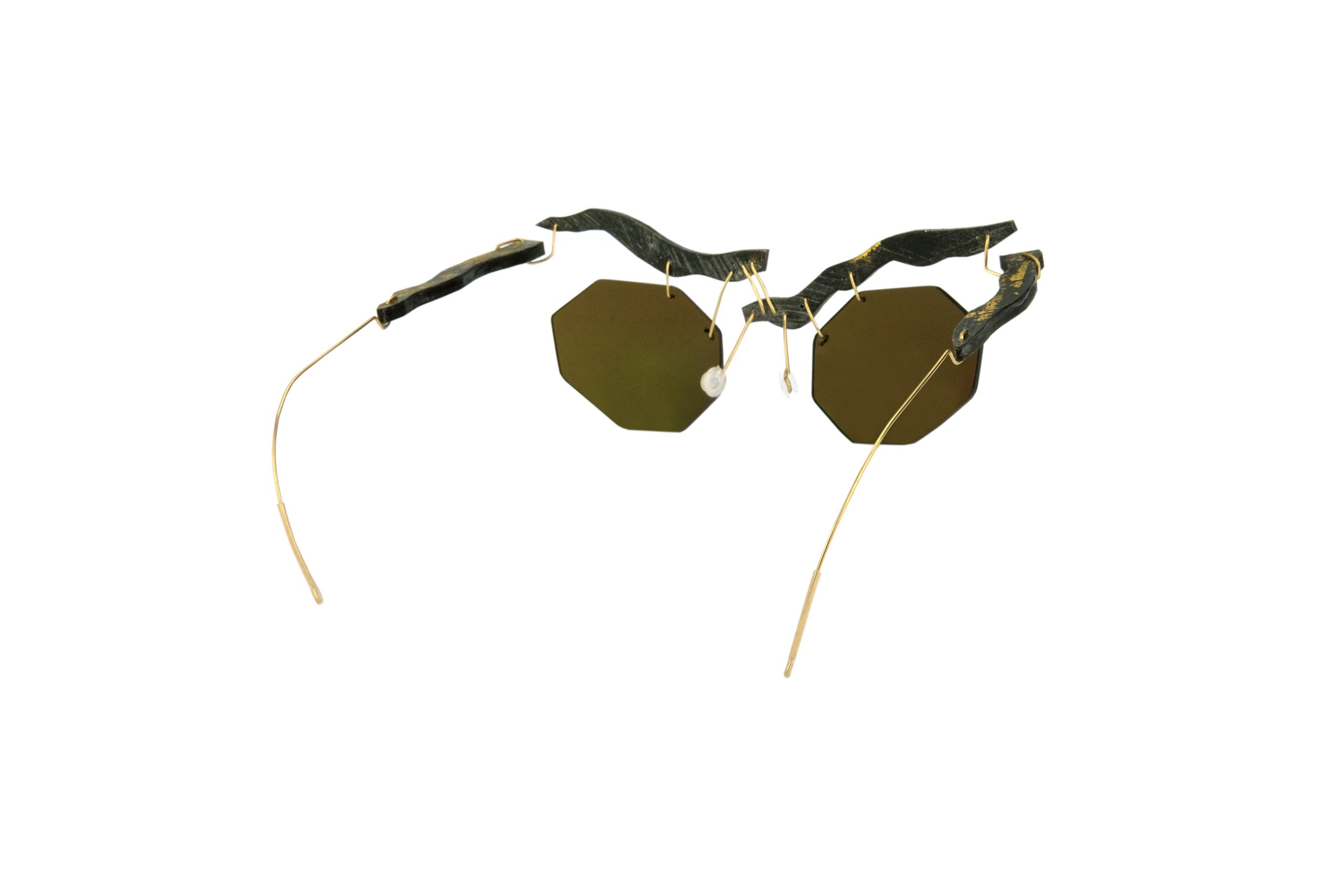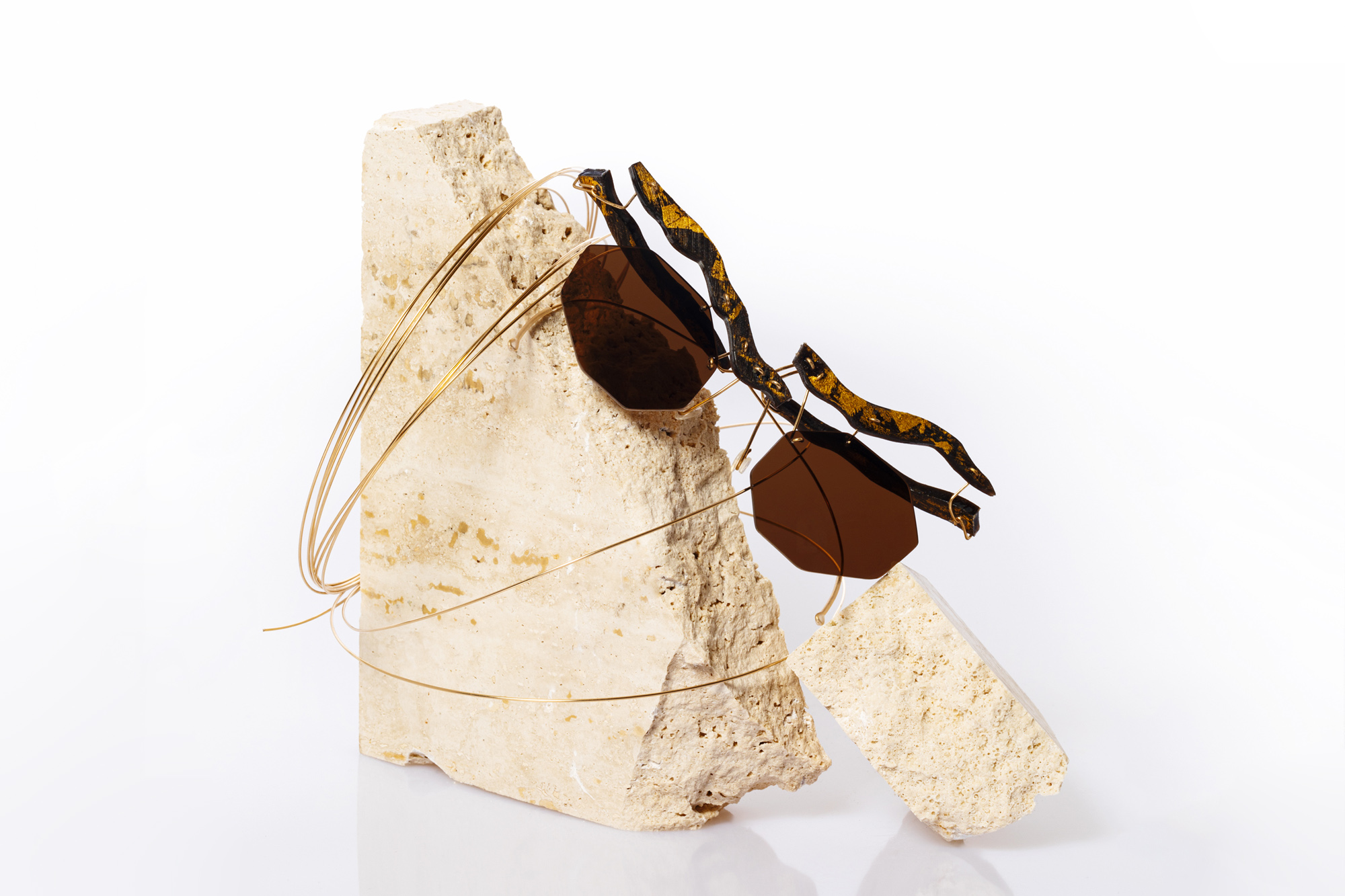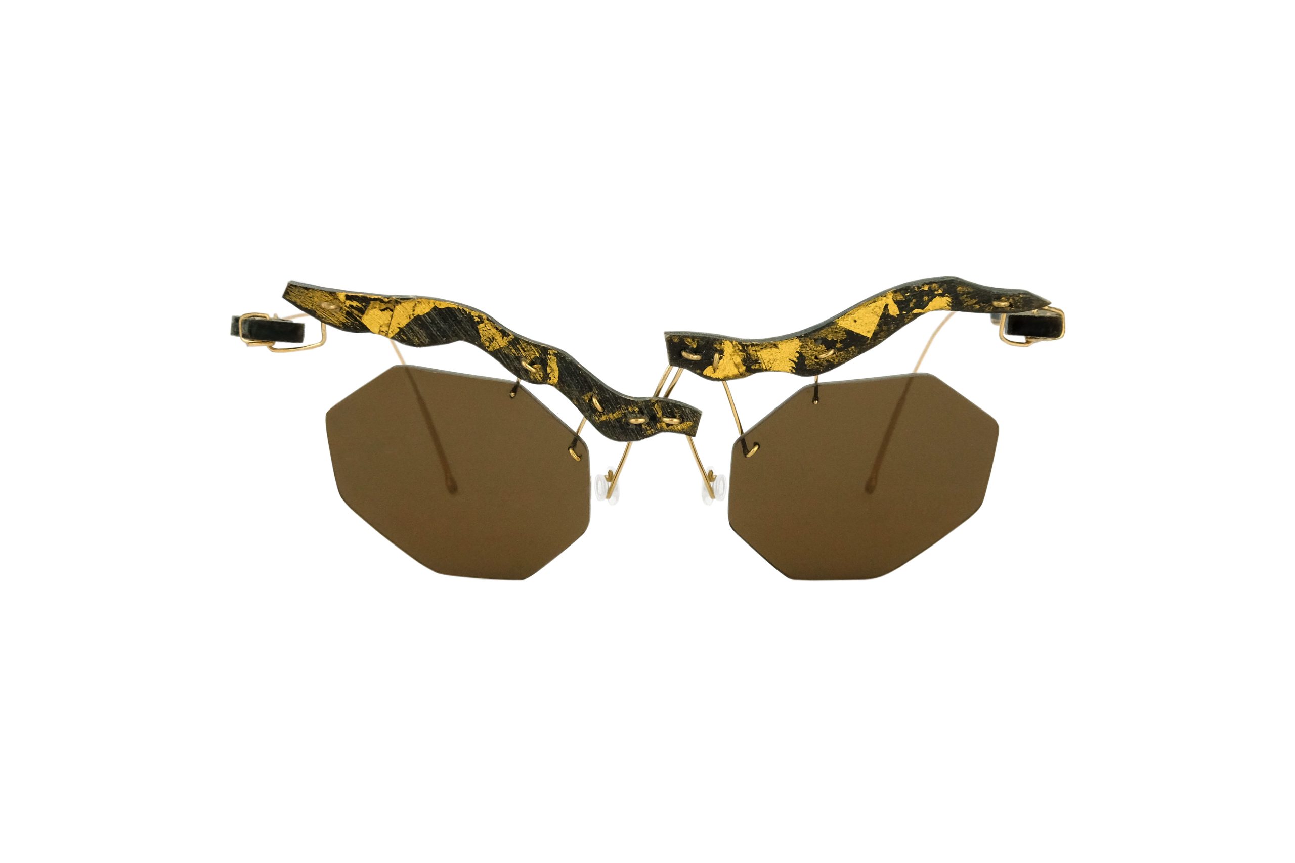 Estremamente resistente grazie all’uso di titanio rinforzato per cerniere e ponte, questo Siana da sole monta stanghette e frontale in corno naturale marrone scuro e oro 14kts con foglia d’oro 24kts.